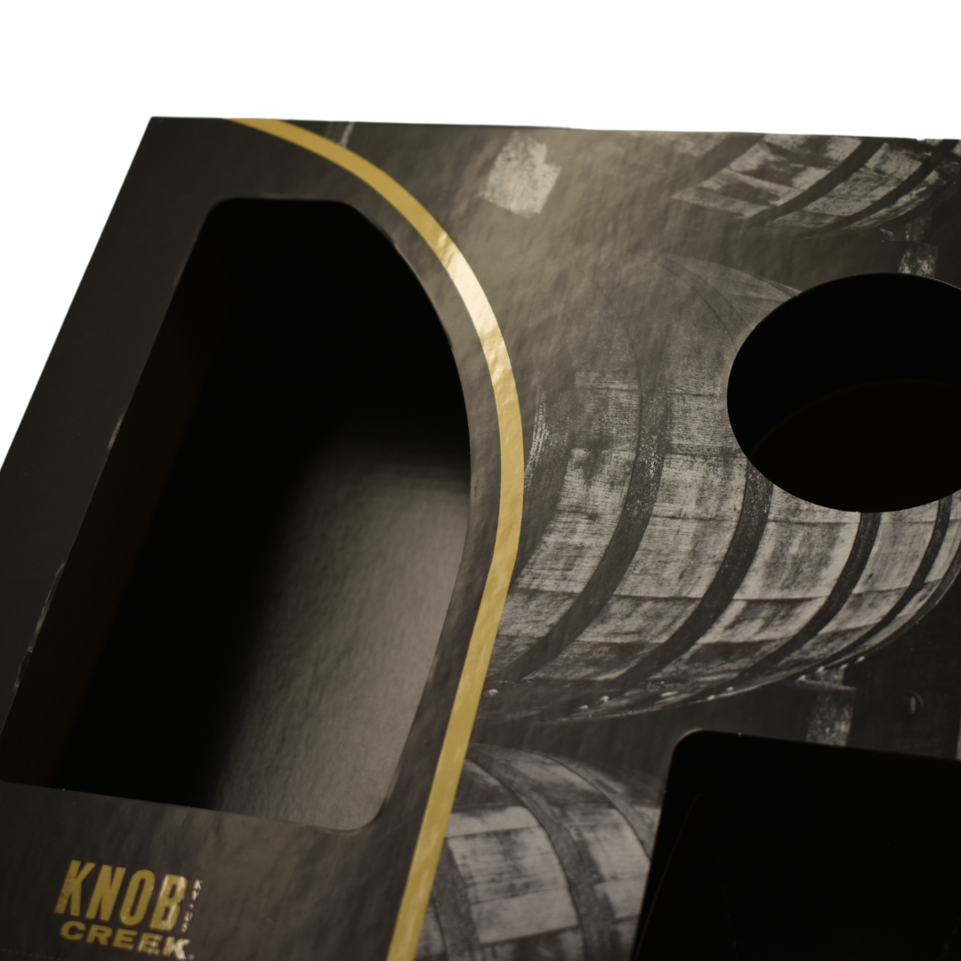 The rigid box was constructed from a 50pt kraft chipboard, wrapped in an 80lb label stock printed sheet for a premium finish. The insert was made from E flute laminated with 12pt SBS, ensuring both strength and a refined appearance. In alignment with Knob Creek’s commitment to sustainability, all materials used were FSC®-certified and recyclable. (FSC® C149826)