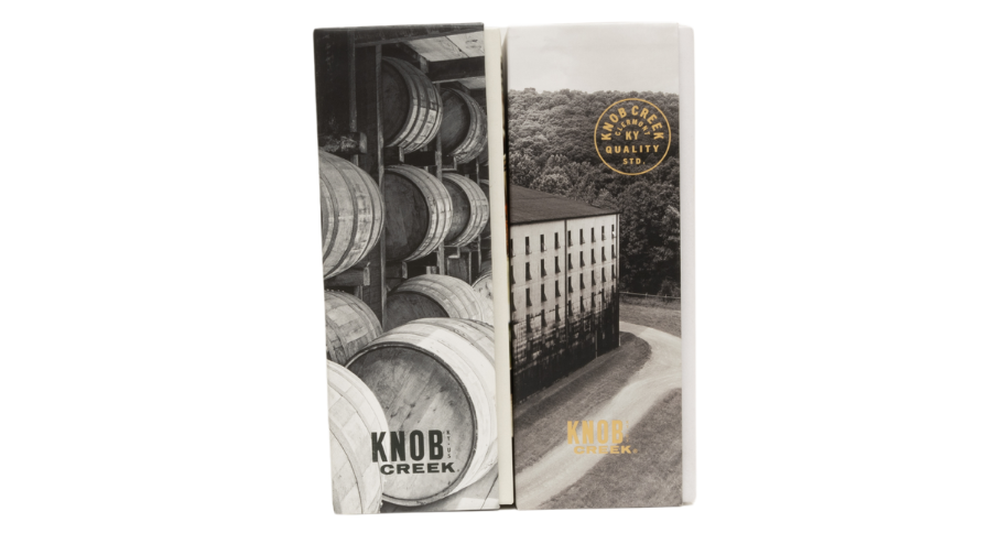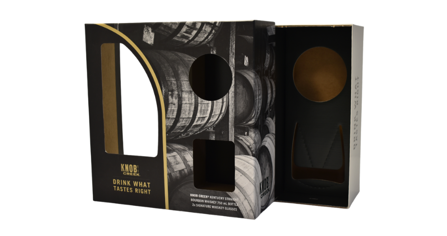 Knob Creek needed packaging for a new gift set, which included a bottle of their Kentucky Straight Bourbon Whiskey and two signature whiskey glasses. The packaging needed to be durable enough to support the weight of these items while also allowing the contents to be displayed attractively.