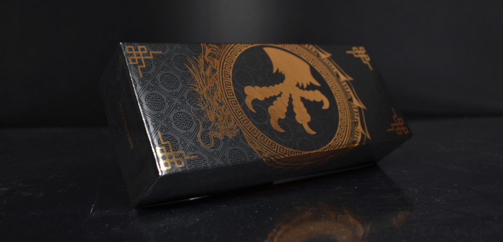 The boxes were printed using four-color process plus two spot colors to achieve the dramatic gold and red metallic colors that represent the Microtech brand. The print was finished with a combination of dull varnish and spot gloss treatments.