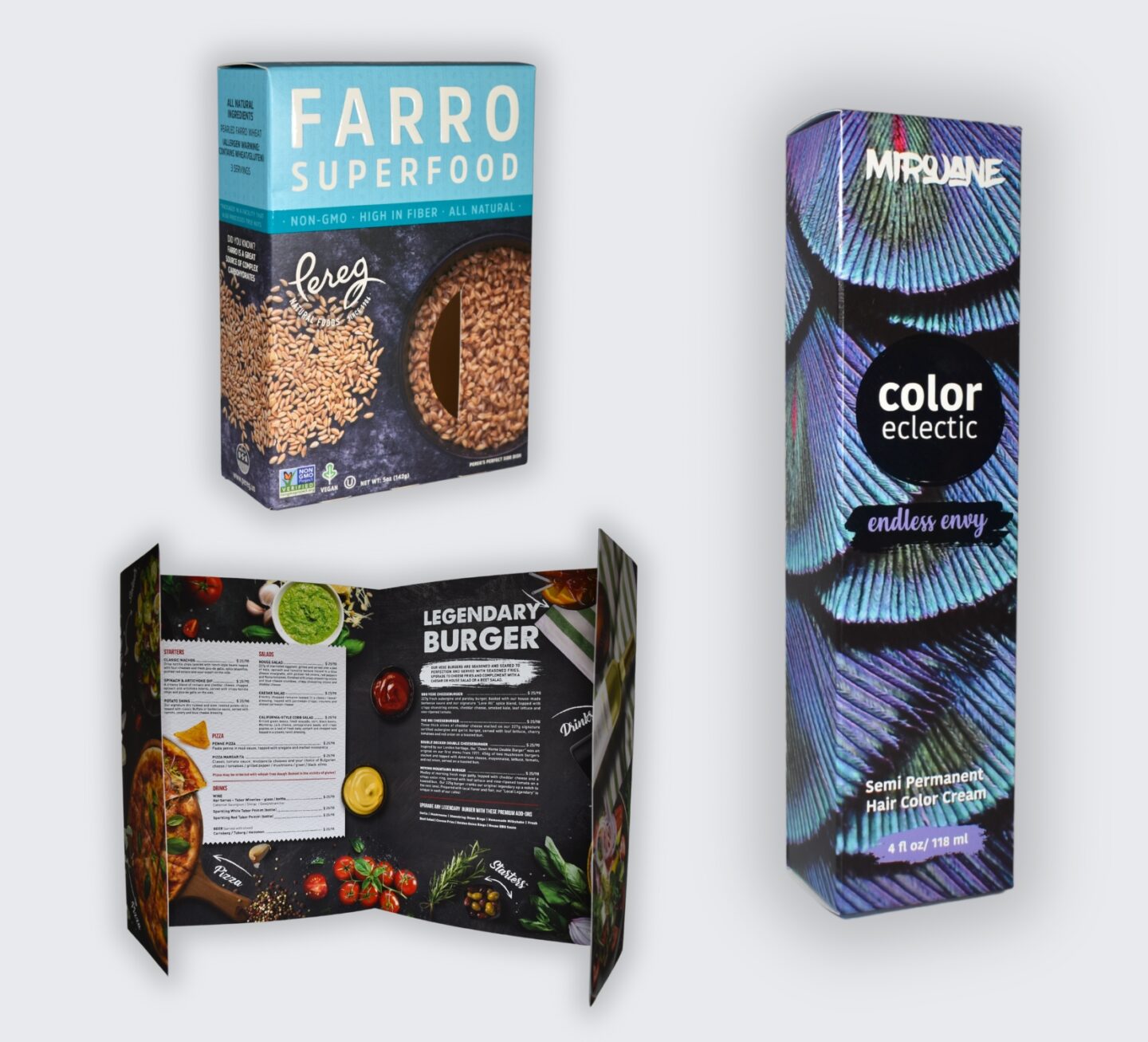 Folding Carton packaging is a low caliper paperboard useful for holding light-weight products. Traditional Folding Cartons are highly customizable to hold a large variety of product types and sizes.