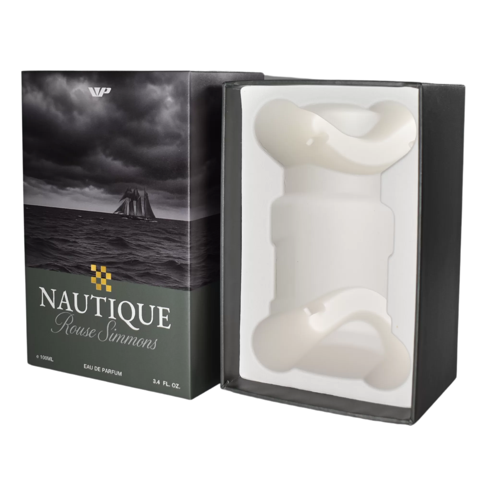 A telescoping rigid box made from recycled chipboard with a molded pulp insert.