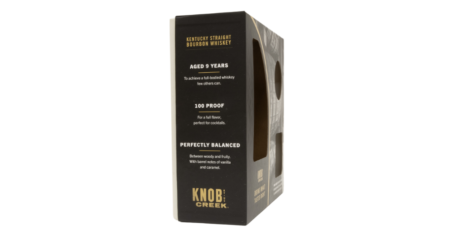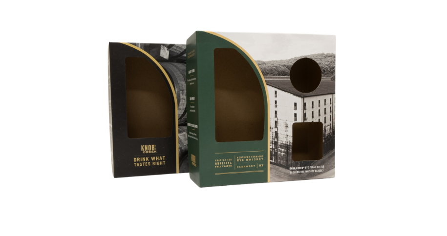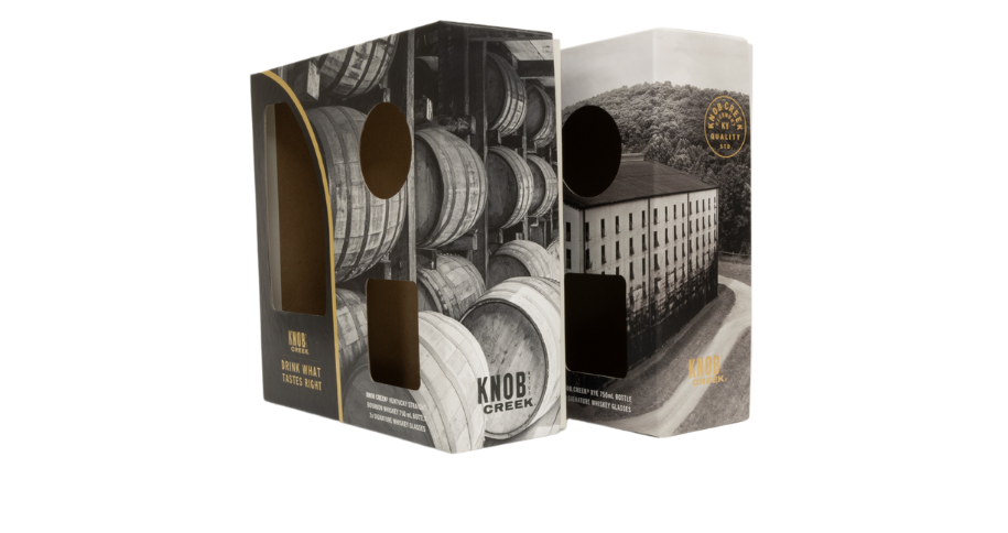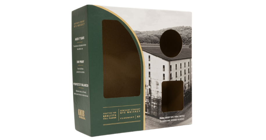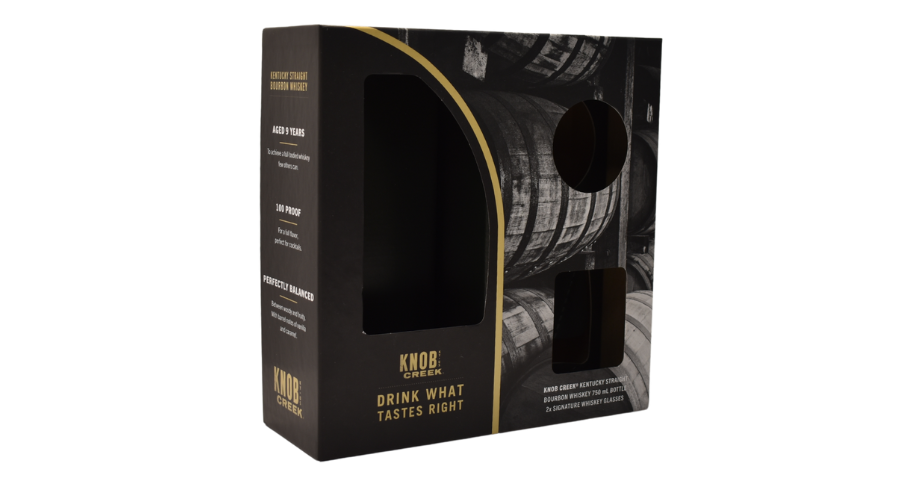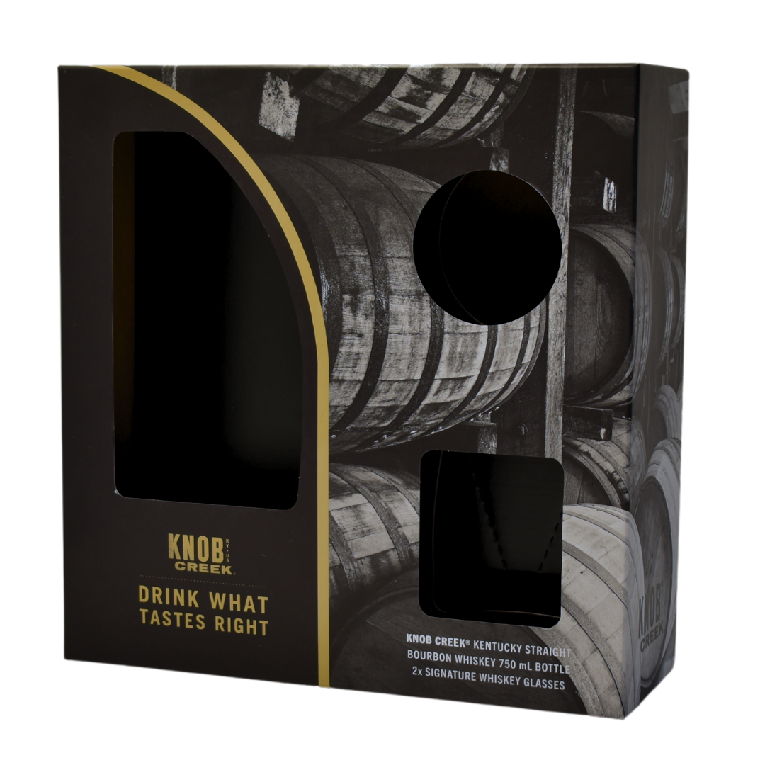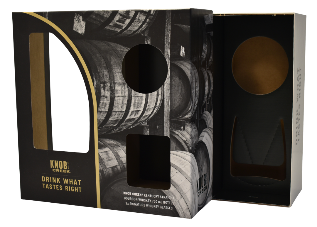 Knob Creek needed packaging for a new gift set, which included a bottle of their Kentucky Straight Bourbon Whiskey and two signature whiskey glasses. The packaging needed to be durable enough to support the weight of these items while also allowing the contents to be displayed attractively.