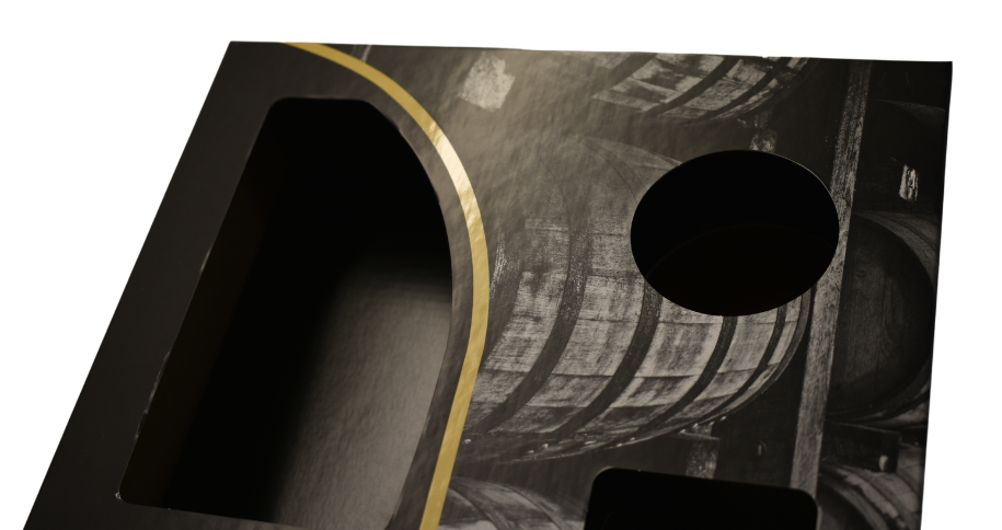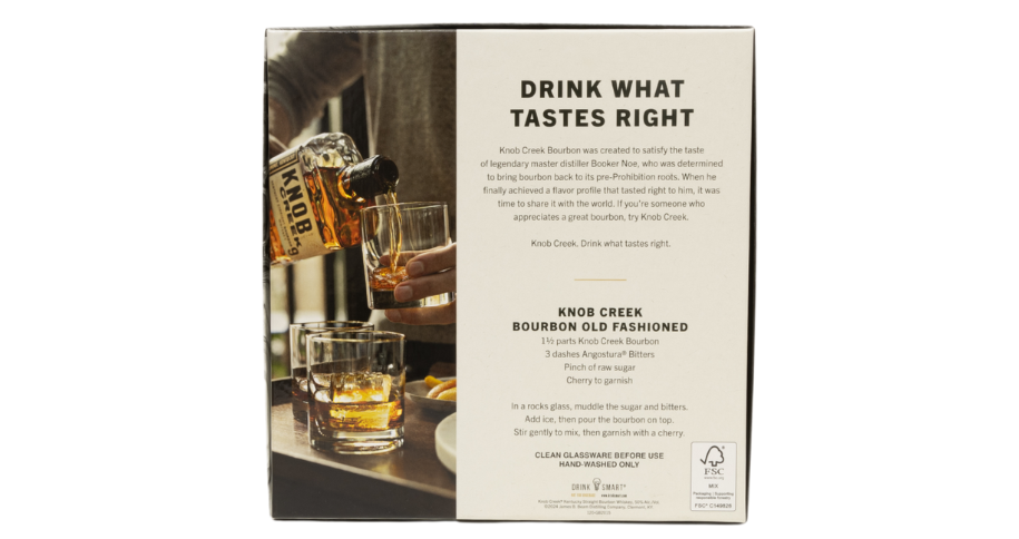 The rigid box was constructed from a 50pt kraft chipboard, wrapped in an 80lb label stock printed sheet for a premium finish. The insert was made from E flute laminated with 12pt SBS, ensuring both strength and a refined appearance. In alignment with Knob Creek’s commitment to sustainability, all materials used were FSC®-certified and recyclable. (FSC® C149826)