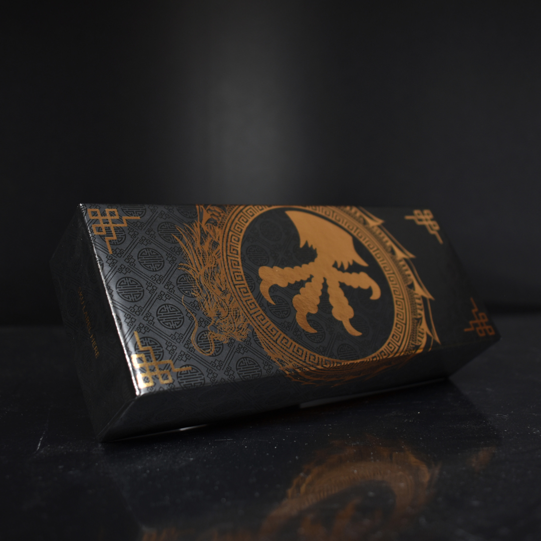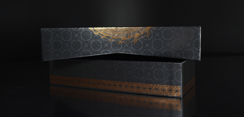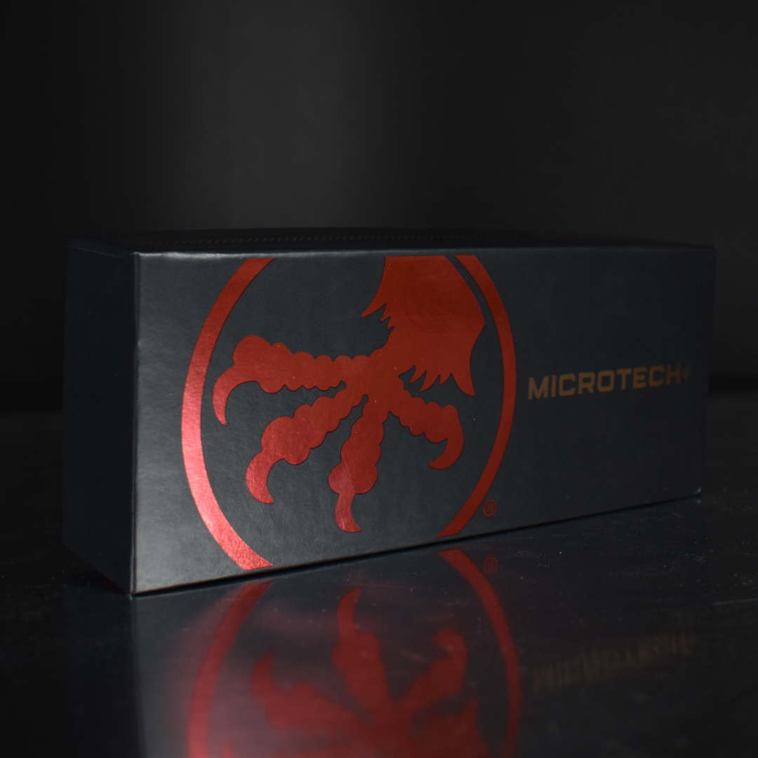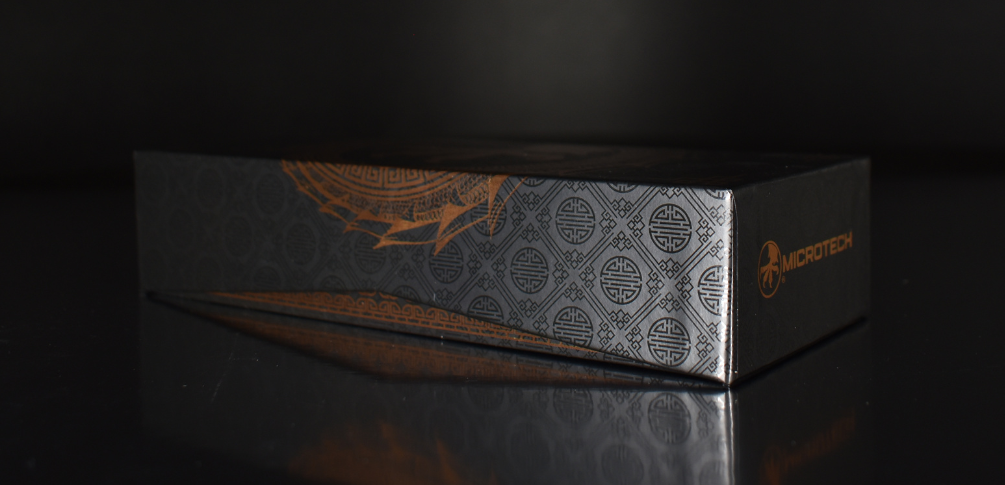 The boxes were printed using four-color process plus two spot colors to achieve the dramatic gold and red metallic colors that represent the Microtech brand. The print was finished with a combination of dull varnish and spot gloss treatments.